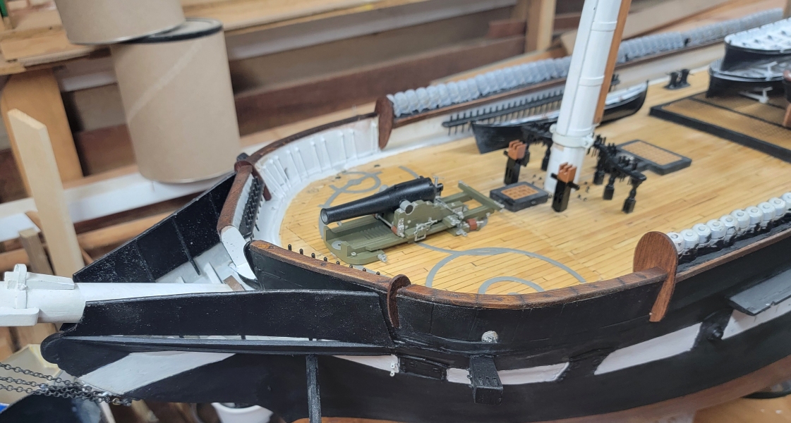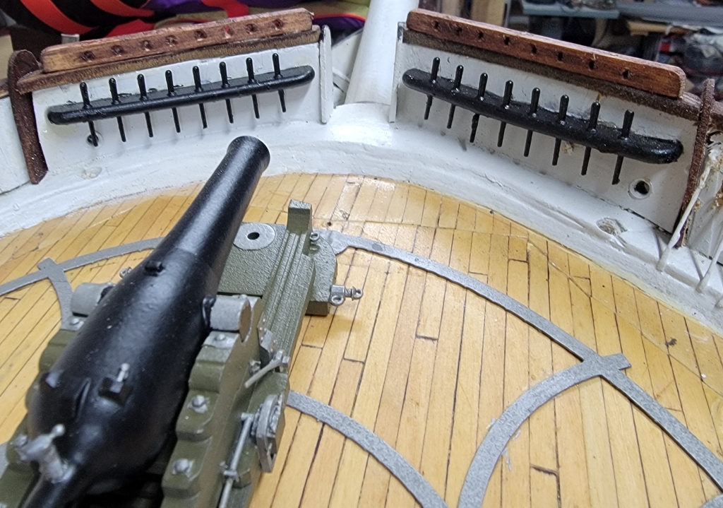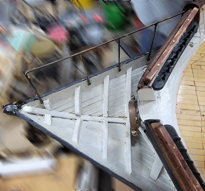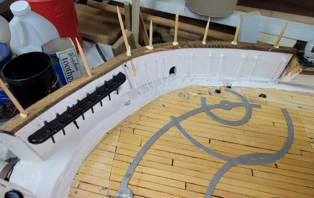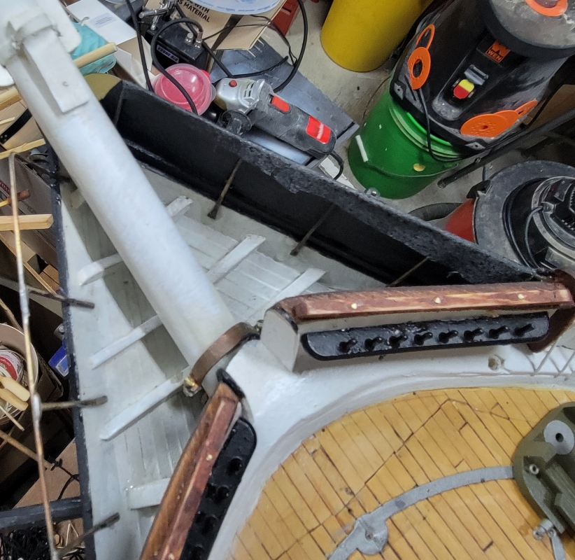 14th: I was thinking I was forgetting something, and I did! There are smaller end-boards at the ourboard ends of the bulwark the bow pin-rails are mounted on. I had to cut a slot in the rails to insert these parts I cut from the old basswood ones. I also widened the slot for the starboard end-board and installed it. That leaves the aft starboard one to do to be done with rails and end-boards.