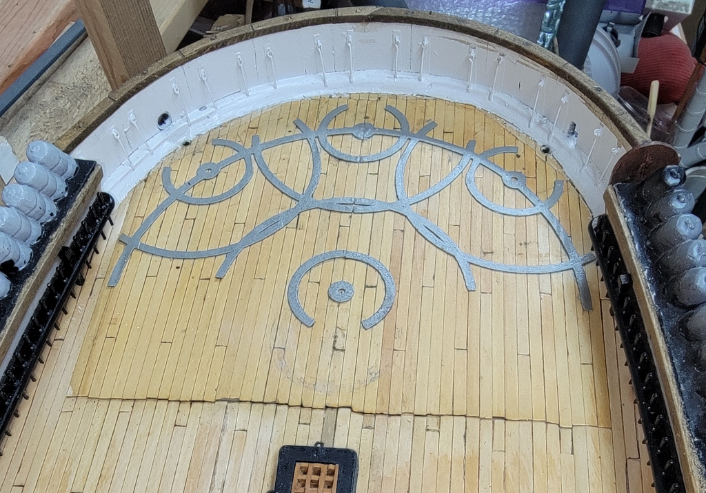 The bottom was CAed to the head-rail, and the aft end CAed to the hull. The loose part was CAed to the brass frame, wrapped over the top. Once I get the port-side screen to this point, they'll be trimmed inside, then laced with Dacron thread to the brass frame, finally getting a brushed on coat of paint.