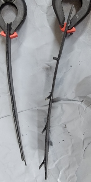 Checking the fit, I cut the legs to length, bent them at the proper places, and hammered the ends of the legs flat so they would attach to the head enclosure. I attached them with CA, then over coated them with 5-minute epoxy.