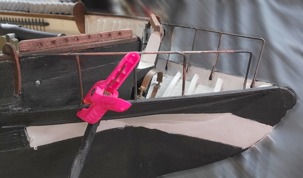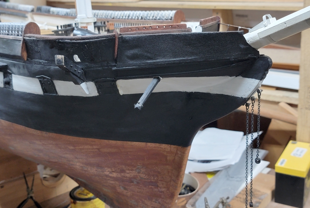 15th: The last end-board on the starboard quarter got installed, and I sat and stared at the model to see if I forgot anything else. Yep, a fair-lead log for the bow pin-rail.