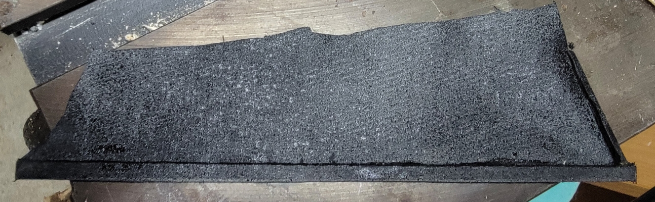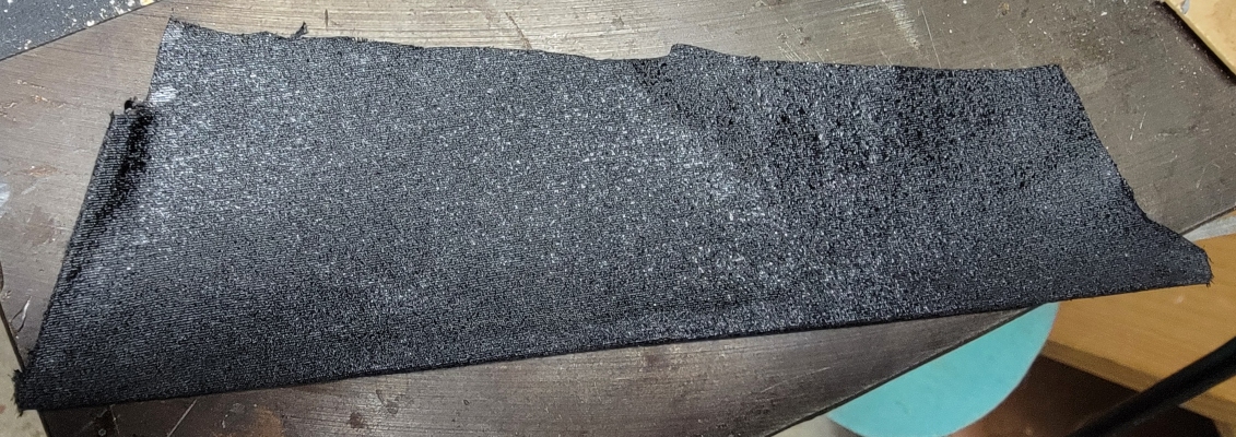 18th: I cut a bit of of gray Supplex cloth for Macdonian's sails and hemmed in a strip of wood for the bottom edge, and one at the aft end, rough cut it to shape, and spray painted it two coats of black, front and back.