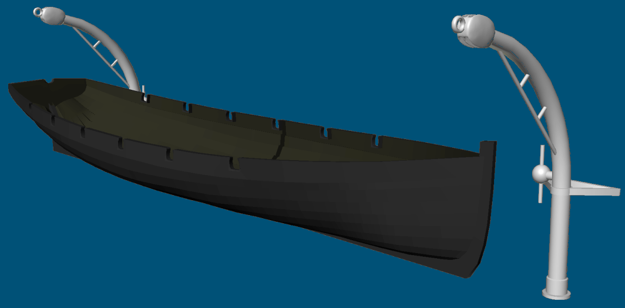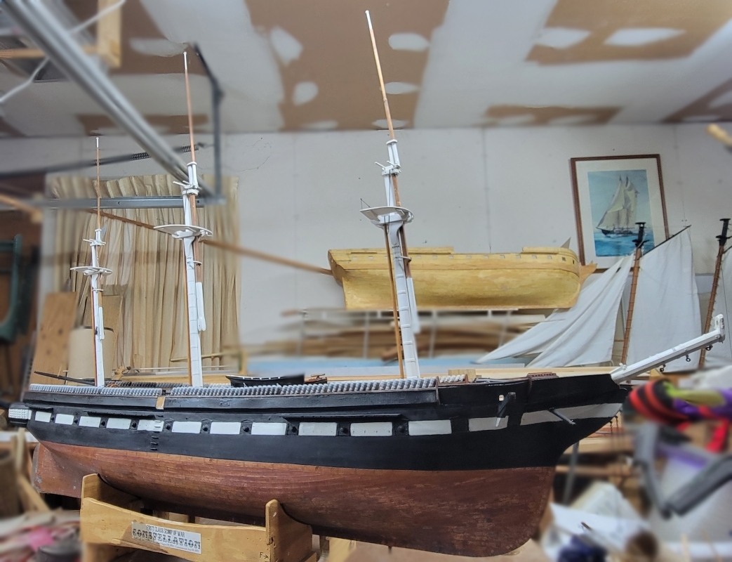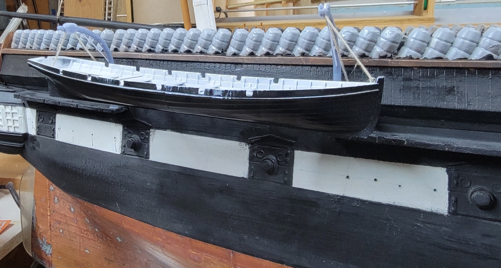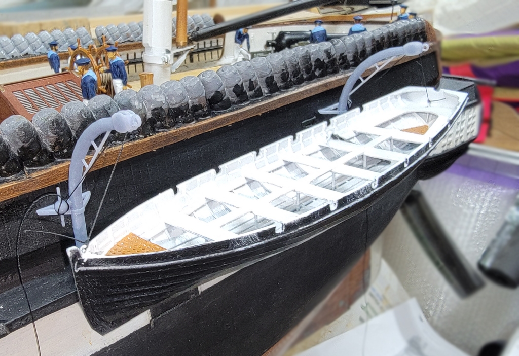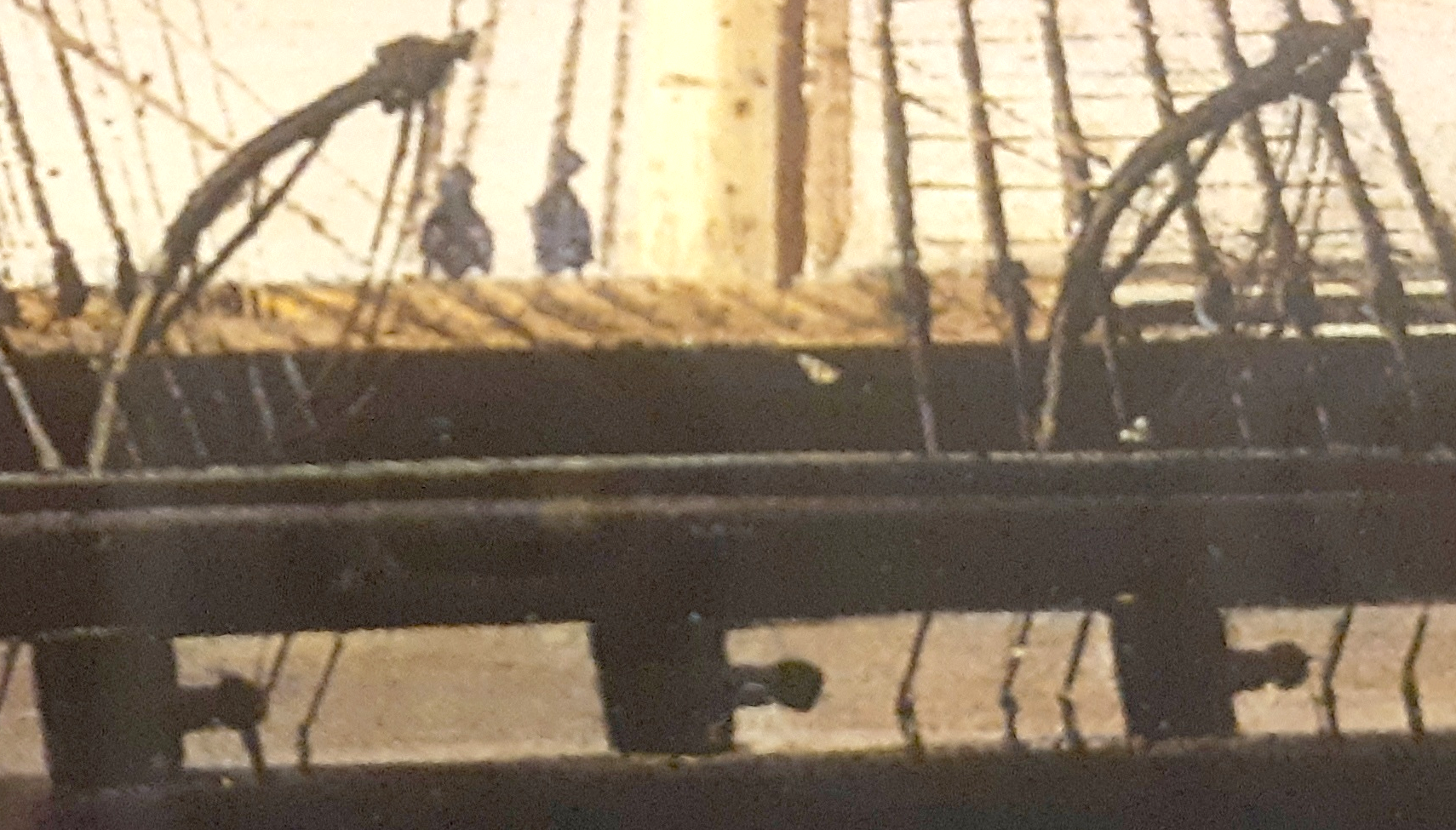 Friday, June 18th, 2025: Still trying to figure out the davits. In the 1856 painting of the ship by Tamoso de Simone, the quarter-boat davits are depicted without the boat in them. Still, it's not much more than a silhouette.