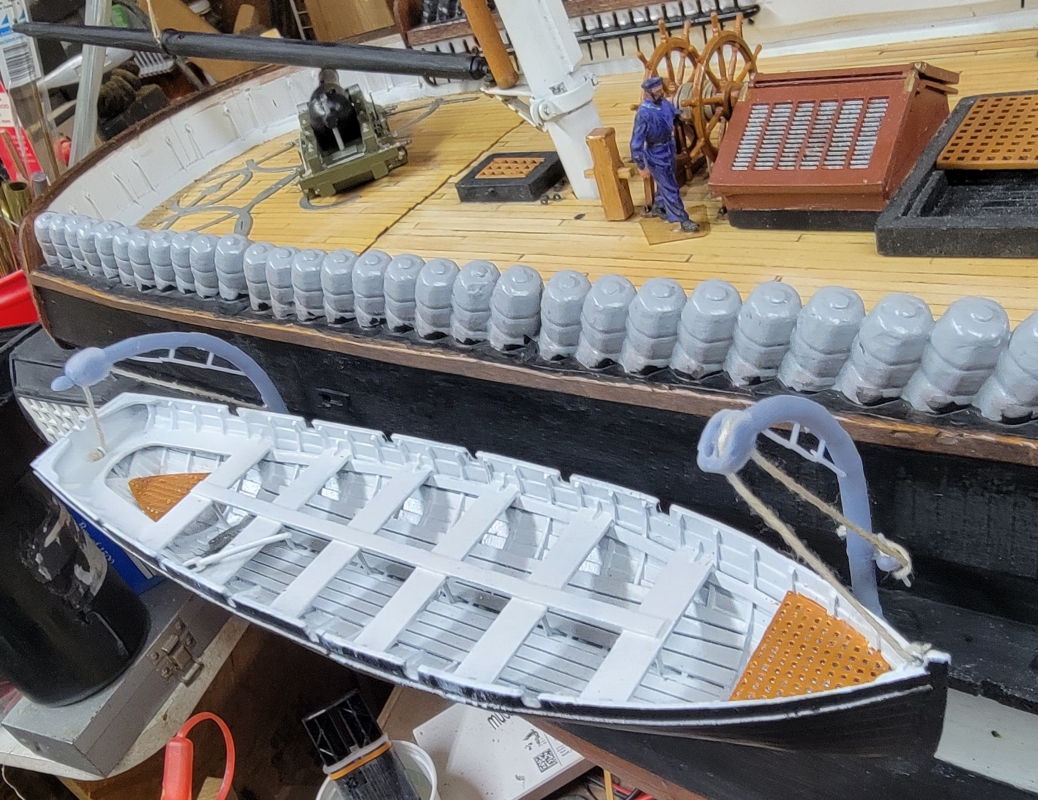 In the 1856 portrait of the ship, there are three definate rub-rails on her side that align with the main hatch. I though there might be some between the davits, by I can't see any. In later paintings, and then photos, the three for-certain are always there, and some were added for the new arraingment of quarter-boats. I decided to install just the three amidships (ignore the '?' I don't know what that's a shadow of).