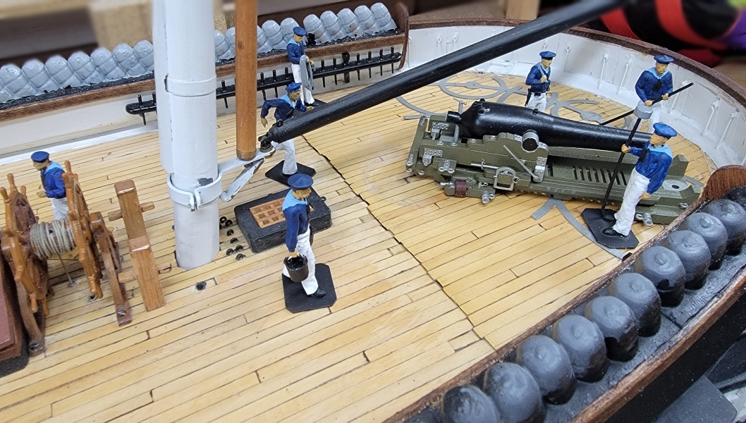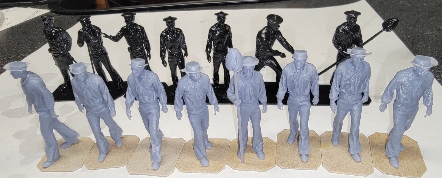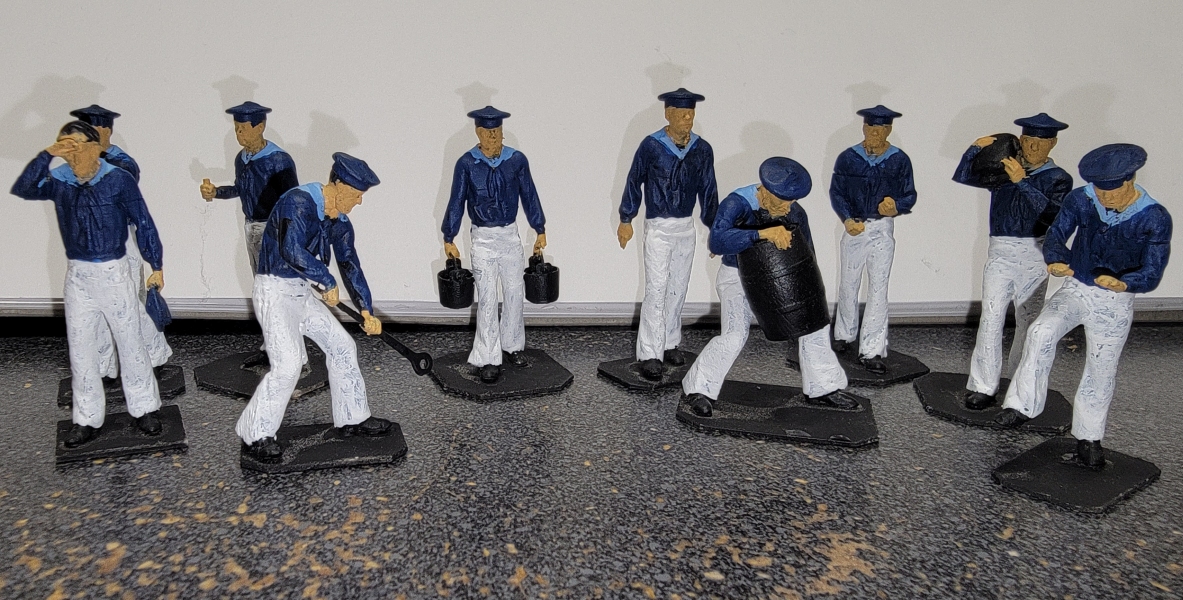 24th: Everyone now has hair, and buckets, cask, pistol grip, handles, etc. There's some touch-up to do, which will cause more touch-up, and so on. I also made a black crewman, there'll be some more, but I have to print more figures.