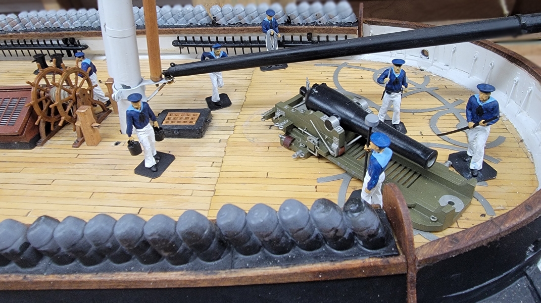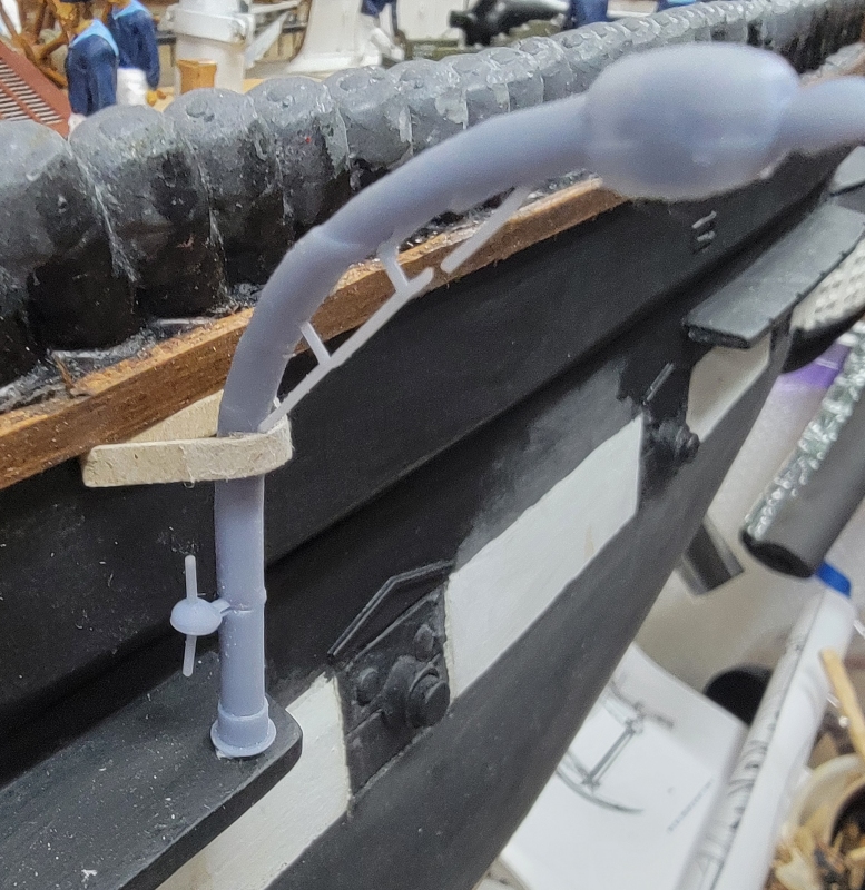 I installed the cleats, clamps, ledgers, whatever, and the printed gratings did not fit well, so I made new templates, and remodeled the gratings. While they printed I painted in the head and rebuilt the gammoning iron (not in picture).
