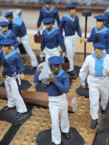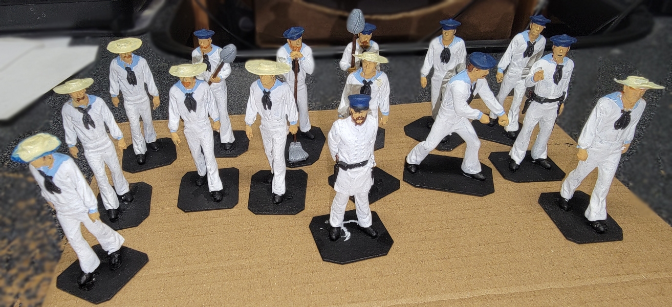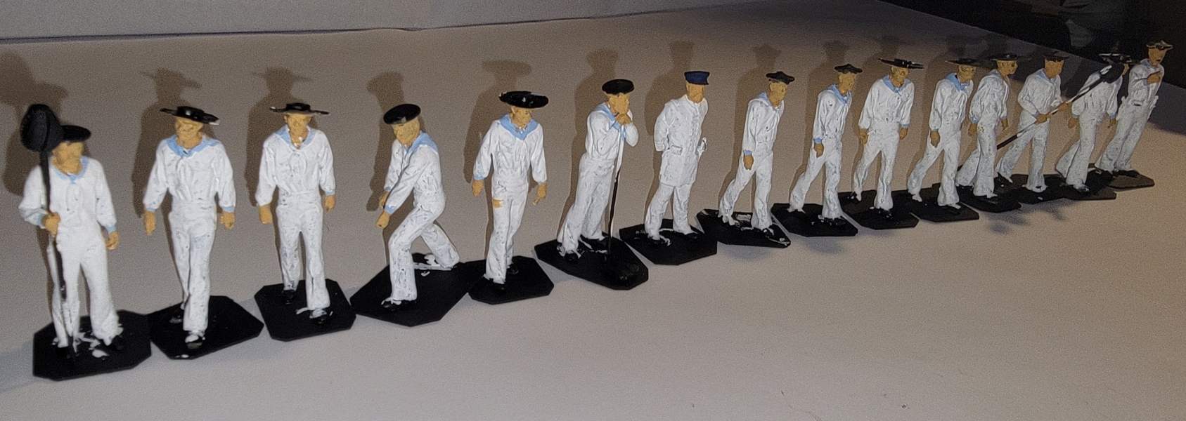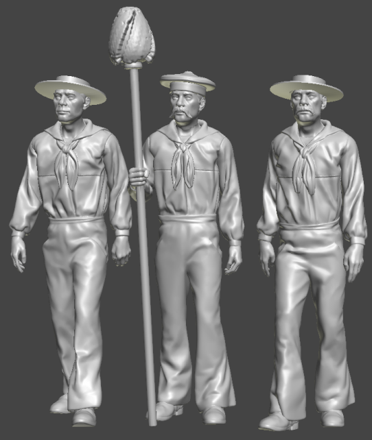 ~28th: I modified the files of three figures; two "walking" figures got straw-hats, and I swapped head and implements on the Rammer fellow, to make a sponger holding his sponge upright, instead of at port-arms.