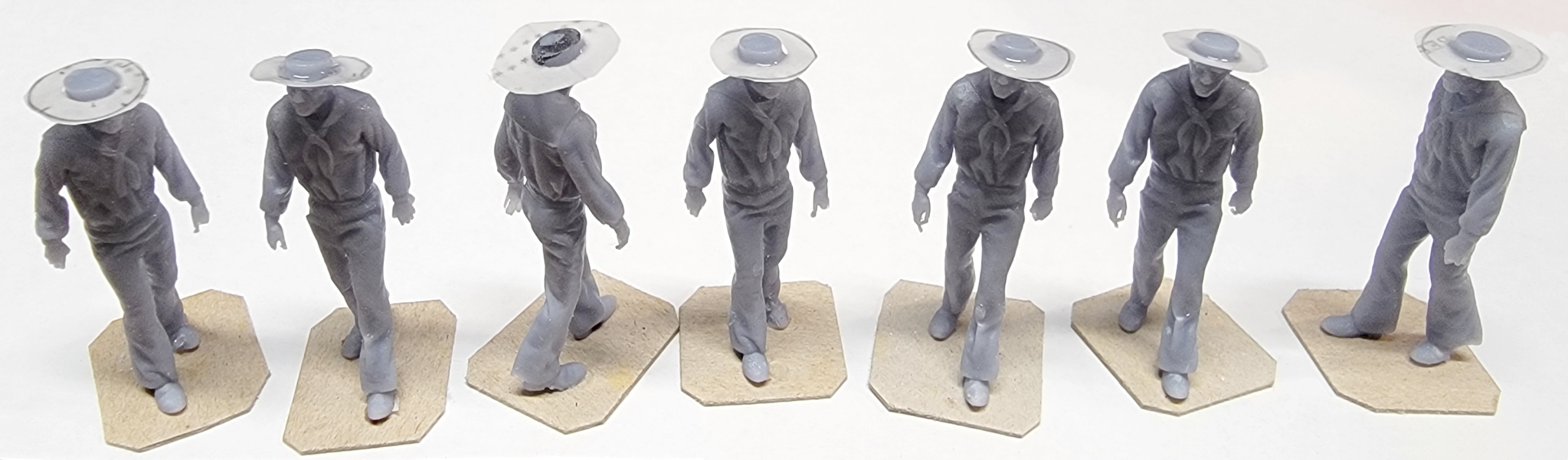 Meanwhile, I printed a batch of "stock figures," but of 11, only 7 came out. I started a batch of the figures I modded, which printed fine, except the hat brims were too thing and didn't turn out. I cut donuts from plain paper and brushed resin from the printer on them, then zapped them with UV making new hat-brims.