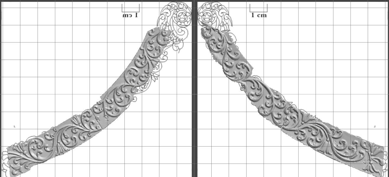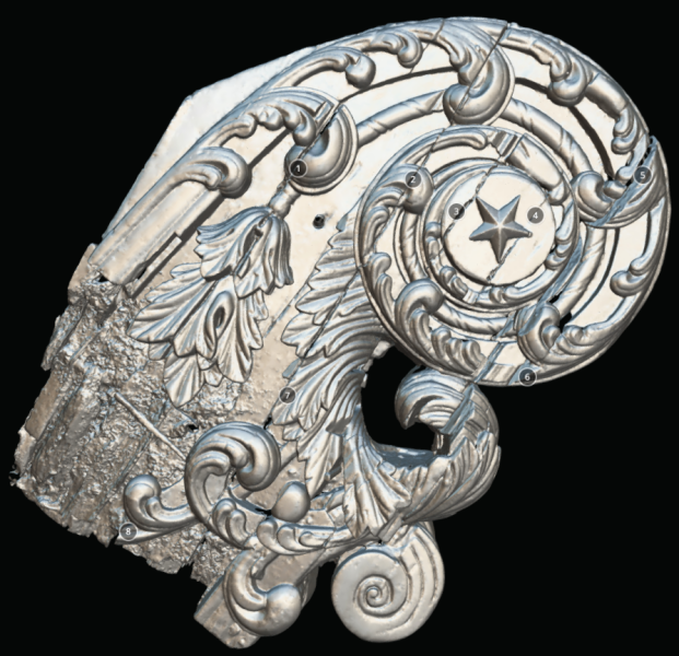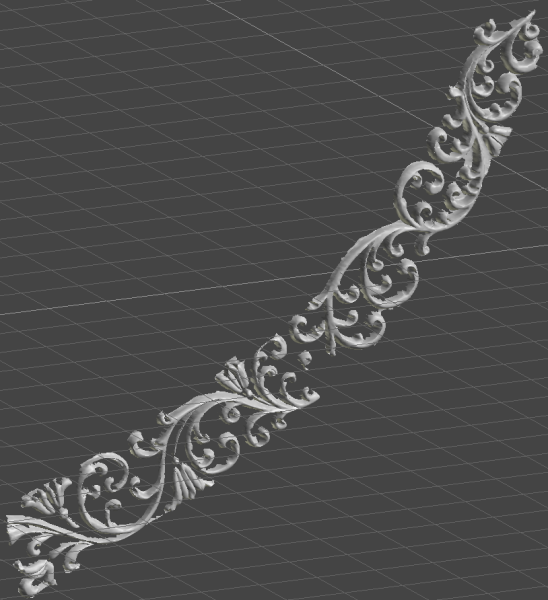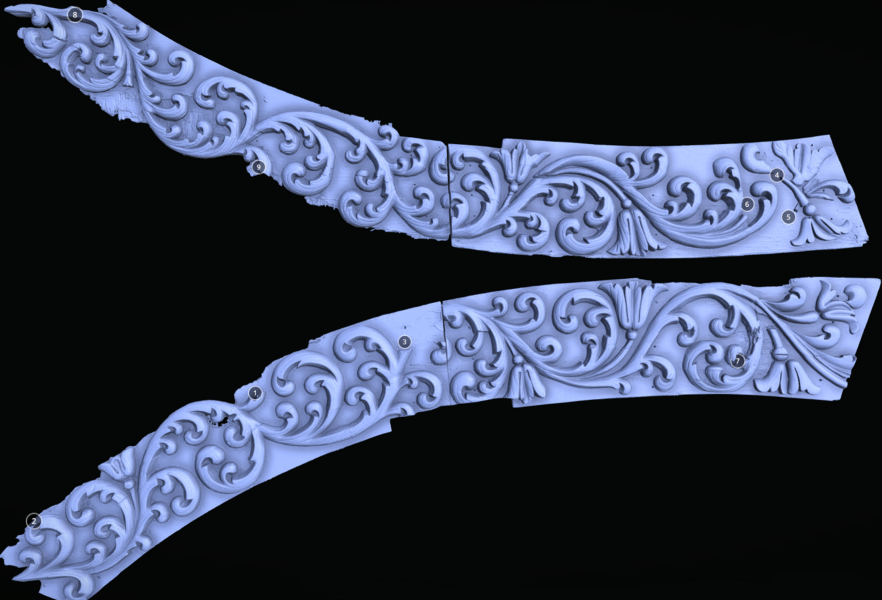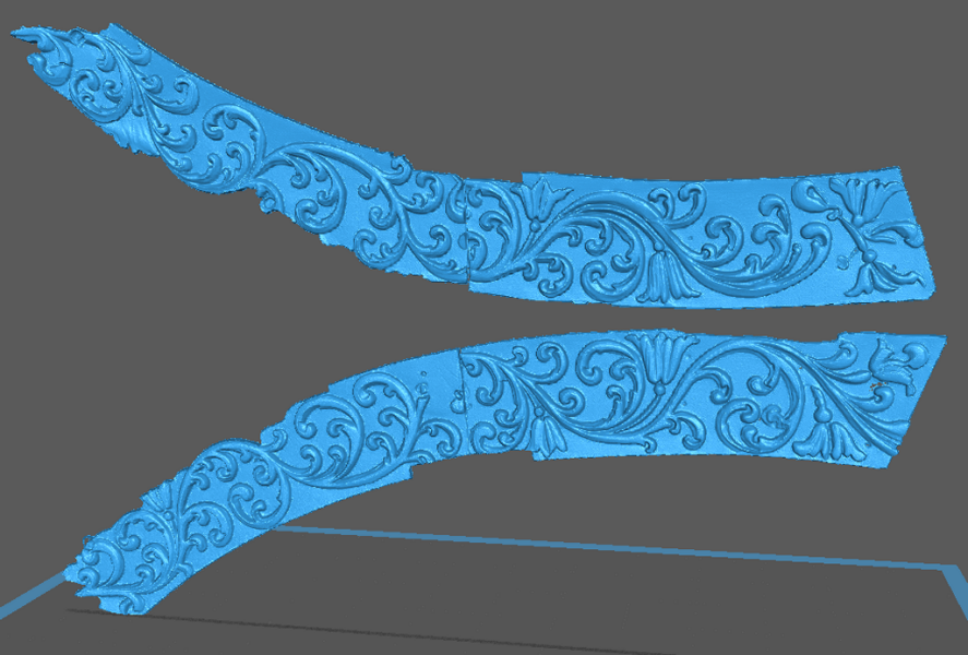 I've started getting the 3D model down to just the carvings, and removing the scanned in backer-board. The sides aren't mirror images of each other, each is a little different than the other side.