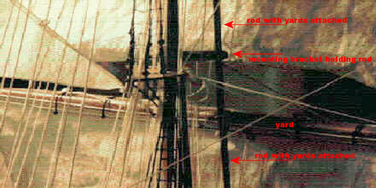 Generally speaking the square sails are hung from spars across the masts called yards. The yards pivot on the mast in the horizontal plane to angle the attached sails depending on where the wind is blowing from in relation to the direction of the vessel. The sails are angled to catch the wind and use it to move the ship forward. The more from the bow (front) the wind is blowing from, the more angled to one side the yards/sails have to be to catch it, but there's a limit; the yards can only turn so far, and once the wind is ahead of that, it'll blow on the wrong side of the sails and actually hinder the vessel's forward movement. The yards are rotated about the mast by the crew pulling on ropes called braces. Get used to the term braces, because they're mostly what this site is about. The braces are typically hauled-in, on one side and paid-out on the other by the crew to move the yards as someone directs them. Our crew is made up of servos, winches, and other mechanisms, to accomplish the same function.