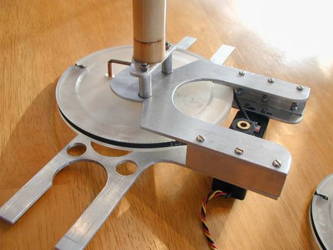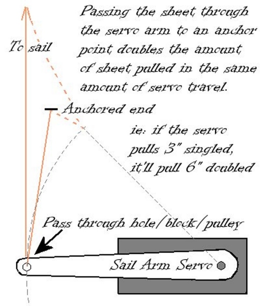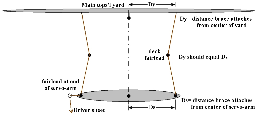 In the second diagram above, the braces pass through the servo arm and anchor to the hull; which can as much as double the length of line being pulled when the arm rotates. In this case they are using that geometry to attach the braces further out on the yard which is more prototypical. Nev Wade uses this for most of his models left.