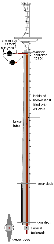 The main draw-back to this sytem is the mast is weakened at the slot where the rod emerges at the top end. On the 1:96 scale model, some half round tubing was epoxied inside the mast, bridging the gap, and strengthening the mast at that spot.