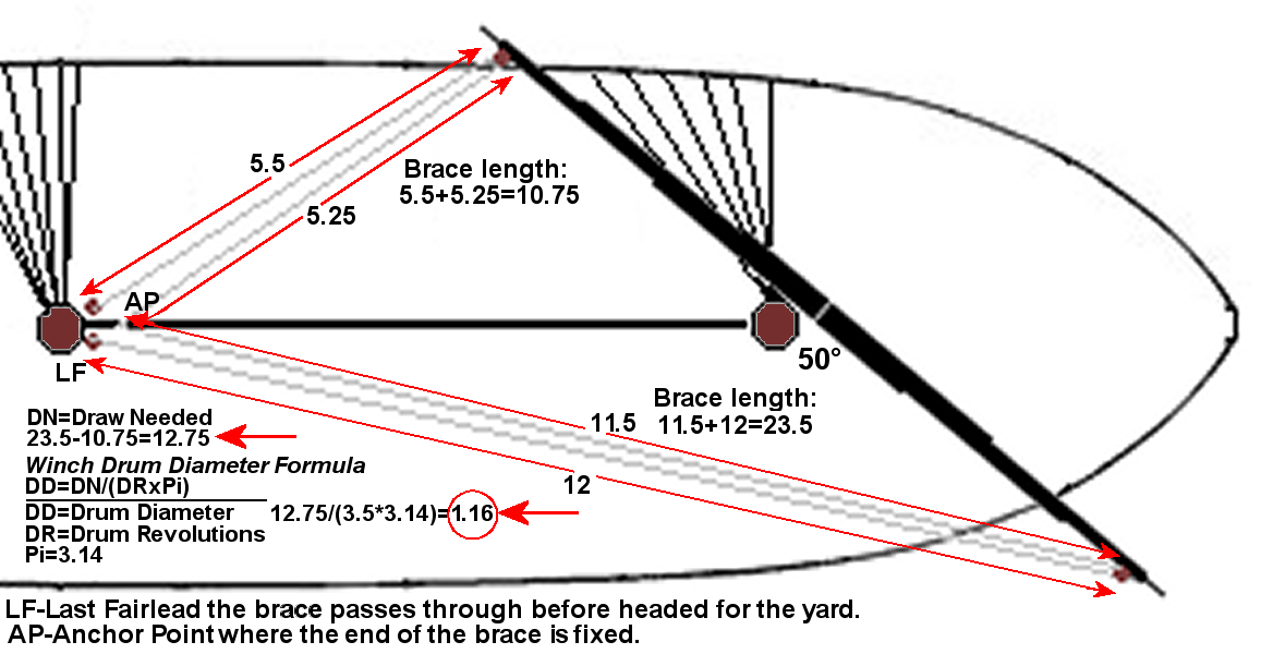 To know what diameter the winch drums for that brace needs to be requires measuring LF to YA and YA to AP. In the diagram, with yard rotated all the way to Port, those measurements are 5.5 and 5.25 or 10.75. With the yard rotated all the way over to starboard LF+YA+AP is 11.5+12=23.5. The amount of line the winch will have to pull in and let out for the yard to rotate from one side to the other is the difference; or 23.5-10.75=12.75.