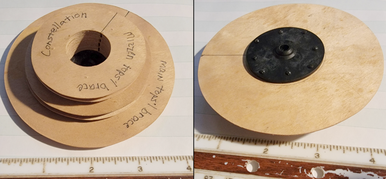 and the flanges a bit larger, I make them 50% larger in diameter than the drum. You need two drums for each brace, one for port, the other for starboard; one draws in as the other pays out. From the thin stock, cut flanges for between each drum;