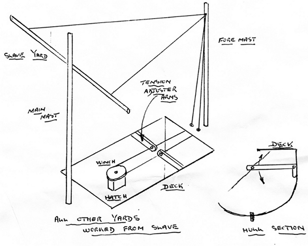 Yet way to manage tension is with springs or elastic (bungie cord). In this diagram the springs/bungie should be under tension with the yards squared across the ship. Springs should not be too strong or excessive tension can lead to damage, like snapped yards.