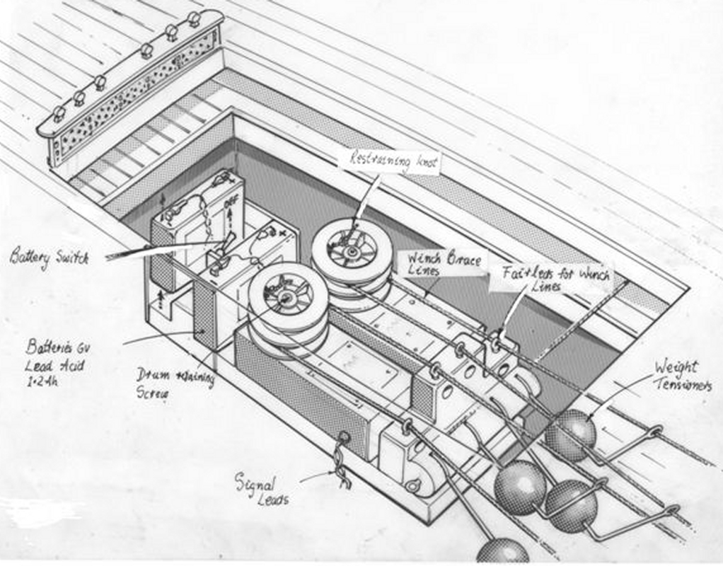 This system provides tension by placing weights on the braces. Like the arms, these weights pull the braces downward, requiring afairleads between them and the winches, as shown.