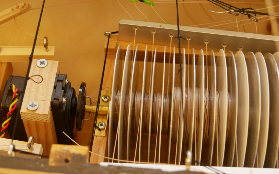 A similar set-up without moving winches is to have the motors or servos drive the drums on an axle. Albert Lheureux used such a system in his Rattlesnake back in 1984. The various o-rings and pulleys allowed slippage