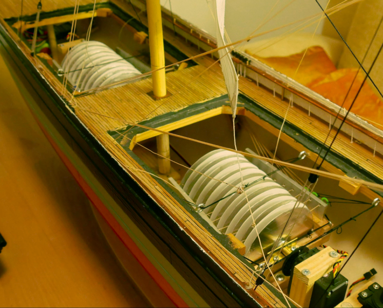 Georg Reinbold uses a more modular, version of this system in his bark Nernberg (1:75 scale, I think). Using sized drums, to get the right pull length for each yard, as detailed previously in the drum-making section;