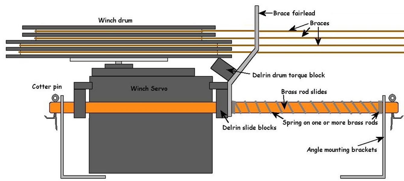 The winch servo is mounted on blocks that slide on rods pushed by springs which are also on the rods. The springs only need be strong enough to push the servo back against the slack in the brace.