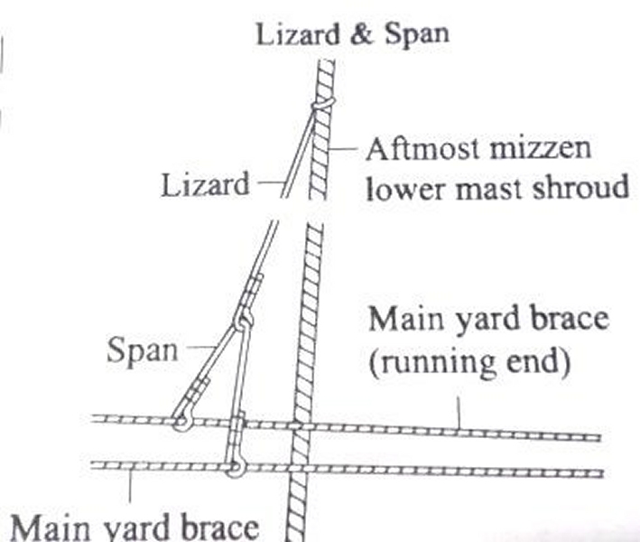 Lizard: Basically a fairlead at the end of a line, meant to hold up some sction of running rigging so it doesn't snag on something else.