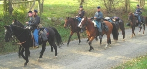 The end of October saw us return to Loudon county and Unison. This year joined by friends from Teennesse and Iowa we fielded 18 troopers with Tom heading us up as captain. Three young fellas, Bill Backus, John Fable, and Caleb Horton, joined us for their first real cavalry event. The event was all we could want it to have been. Riding and skirmishing, a stop in Unison for their celebration, and a bit more fighting with the Rebs. As we camped in the woods on a farm just west of Unison called Fiddler's Green sometime after midnight on November 2nd, our long time friend and compatriot, Bill King, passed away in his sleep. When Bill didn't respond for roll call we went to see what was wrong. A ambulance was called and paramedics tried to revive him to no avail. In shock we gathered ourselves up and packed our gear, and his. It was decided to march back and five men were detailed as escort for Bill's horse Dillon. His effects were packed and his boots placed in the reversed stirrups. Quietly, solemly, we marched back to Philomont.
