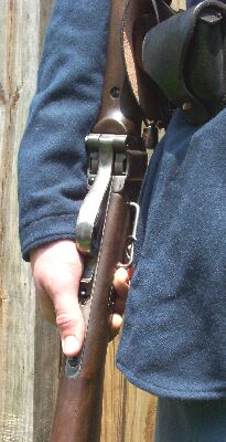 pressing against the under part of the guard, the thumb in rear of the stock.
